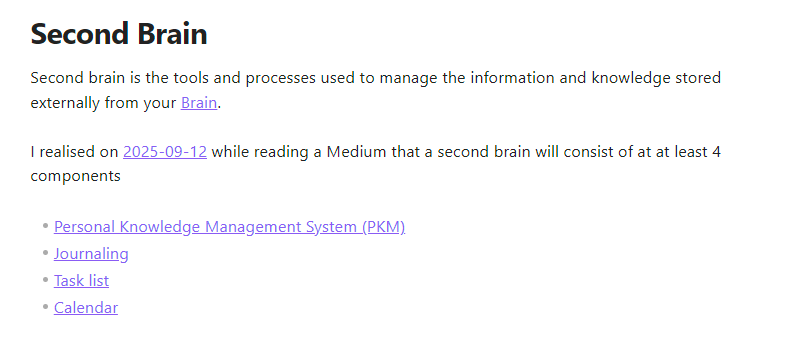 “I realised on 2025-09-12 while reading a Medium that a second brain will consist of at at least 4 components